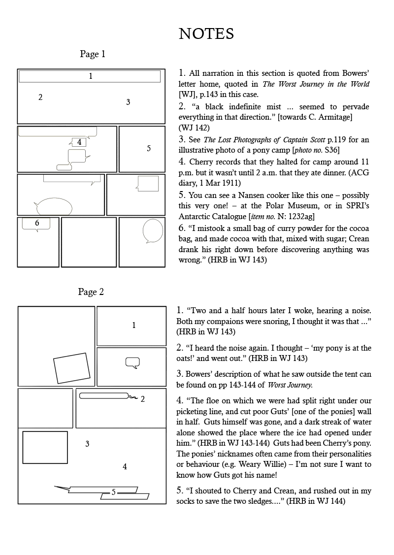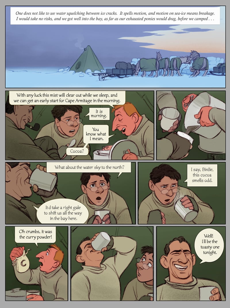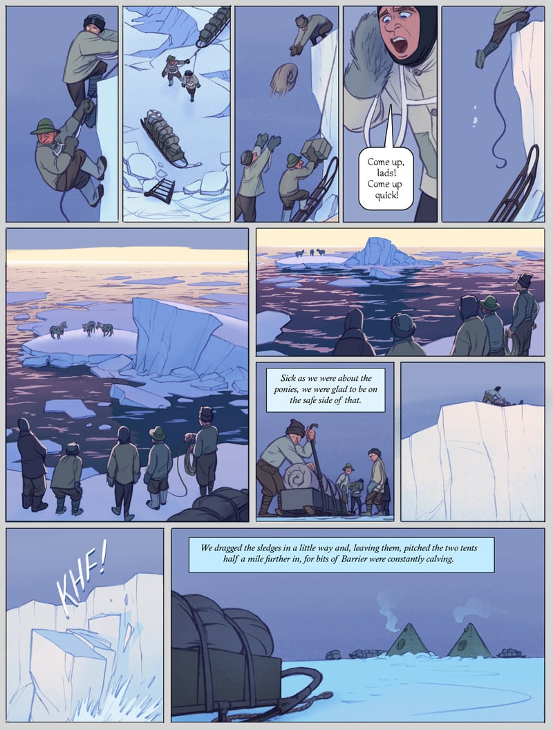 12 pages of historically accurate polar adventure, as Our Intrepid Heroes find themselves on sea ice that has broken up and is floating out to sea. With endnotes for extra nerdy funtimes! This is a sneak peek of what's awaiting in Vol.2 of The Worst Journey in the World – help the rest of it come to fruition (and watch it happen) at https://www.patreon.com/tealin